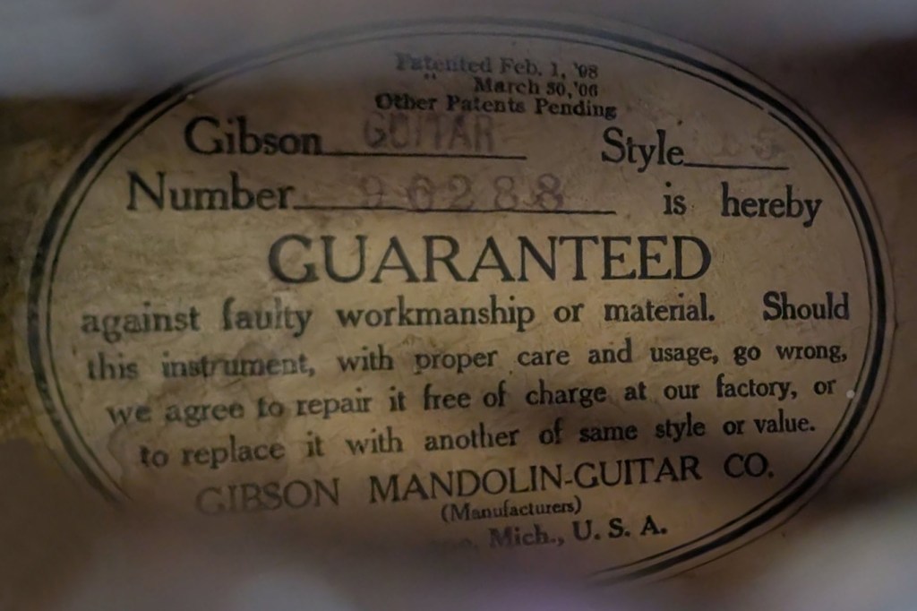 Hardware: Gold-plated metal parts including wrap-over tailpiece and individual open-back Grover 98G ‘Sta-tite’ tuners with butterbean keys