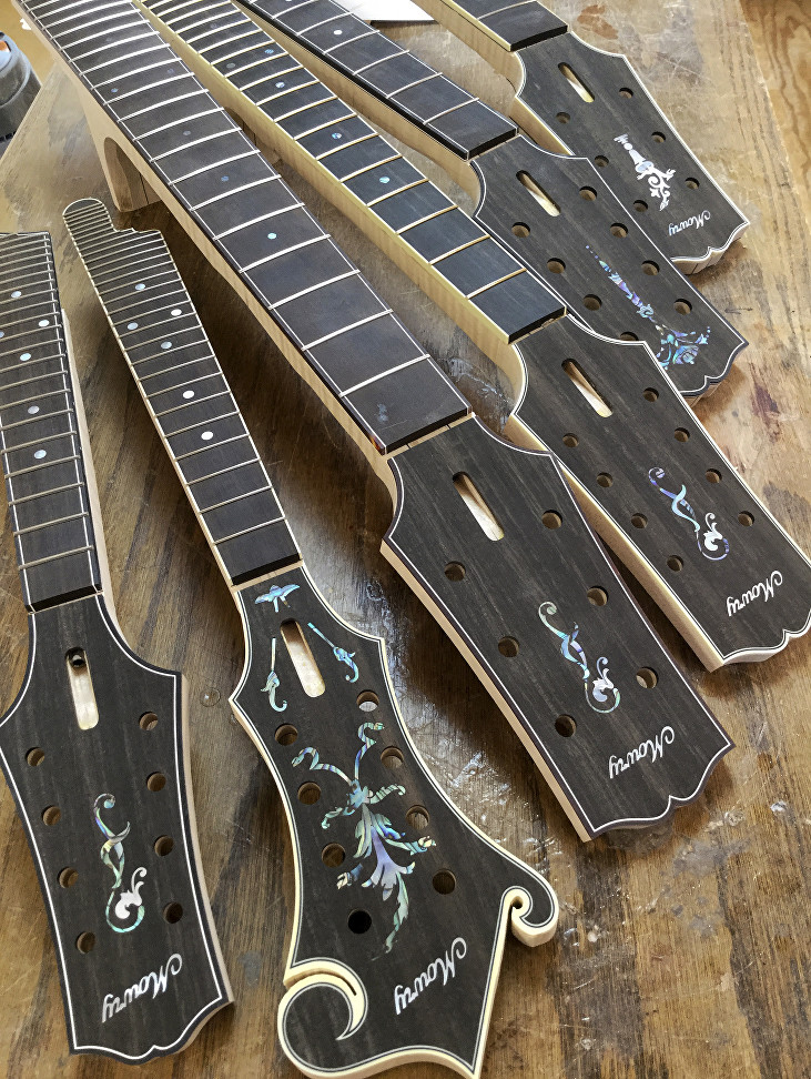 “Next I begin making the fretboard, which is also cut on the CNC. I can make fretboards with any radius, width, etc. The following photo shows the fretboards with their binding and inlays.