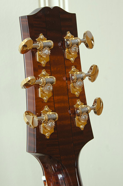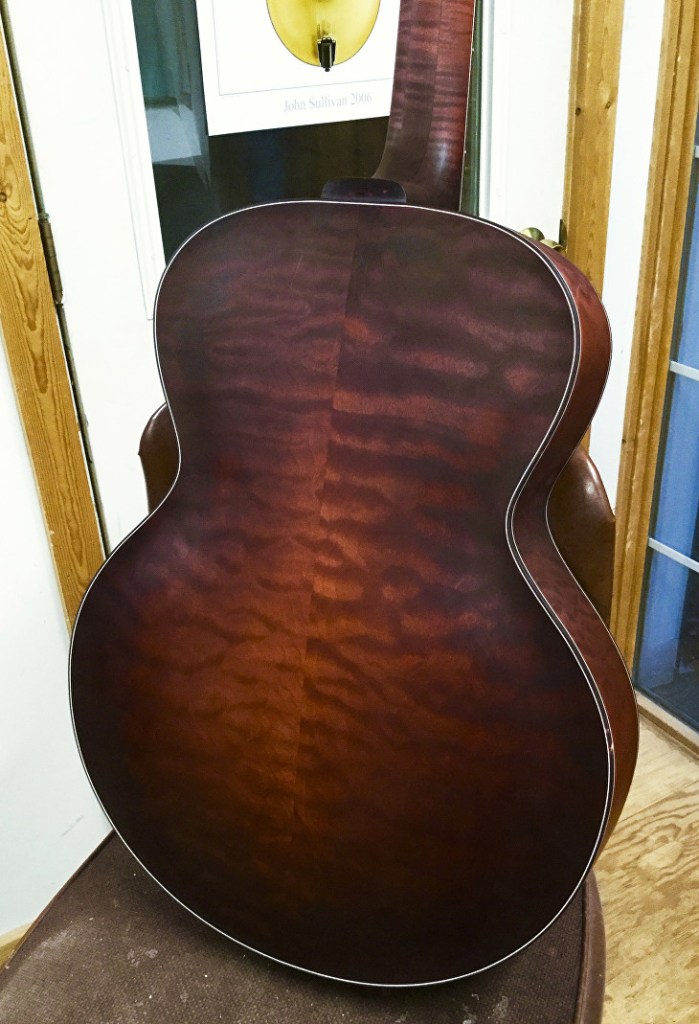 “Peter wanted a fairly traditional L-5 but with a warmer sound and more modern look. We settled on an Adirondack (red) spruce top, quilted maple back and sides and X-bracing, the latter two features helping to warm up the tone and accentuate the low end.