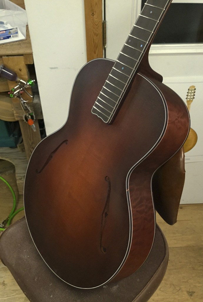 The nitrocellulose topcoats have been applied here with many hours of sanding between coats. I allow them to cure for a few weeks before final sanding and buffing. You can see the colour better now. I have used it on many of my instruments and call it ‘chestnut’.