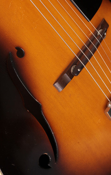 16 3/8 inches wide, it featured a spruce top, solid walnut sides and a laminated walnut back. Details included three-segment or regular f-holes, an asymetrical headstock with ‘banner’ style logo and an ebony fingerboard with a rounded end and four-point star-shaped inlays. Hardware was nickel-plated. In 1934, the model was upgraded with a carved walnut back and gold-plated hardware. The fingerboard, which was now rosewood, had a square end and pearl block inlays, while the headstock carried a ‘vine’ inlay and a large block-letter logo.