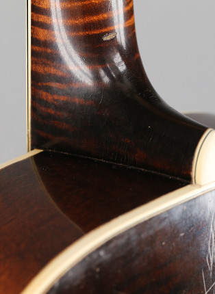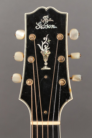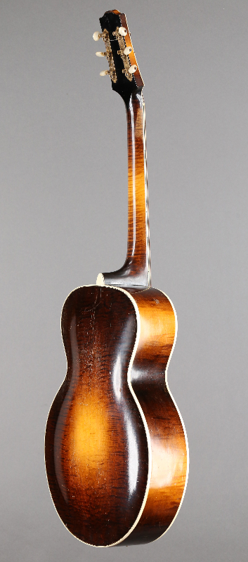 Shipped in 1931 (serial number 87780), this custom ordered L-3 Special boasts various L-5 appointments including a pearl flowerpot headstock inlay, gold-plated Waverly three-on-a-strip tuners with pearl buttons, a gold-plated wrap-over tailpiece, a 20-fret, dot inlaid ebony fingerboard with a pointed end and f-holes.