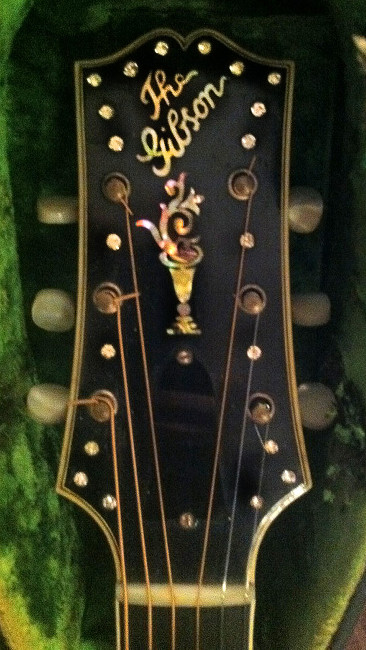 Headstock: Diagonal ‘The Gibson’ logo with rhinestones added by a previous owner