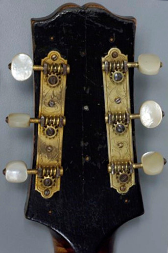 Hardware: Gold-plated metal parts including wrap-over tailpiece and Waverly three-on-a-strip tuners with engraved baseplate and pearl buttons, mounted so that the cog is positioned below the worm gear. Replica short bound pickguard
