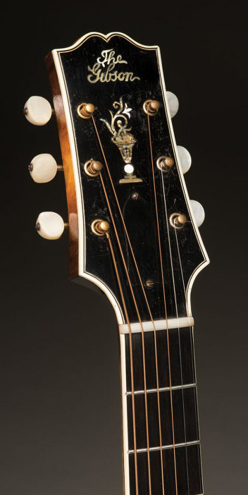 Hardware: Gold-plated metal parts including wrap-over tailpiece and Waverly three-on-a-strip tuners with engraved baseplate and pearl buttons, mounted so that the cog is positioned below the worm gear. Short bound pickguard and ebony bridge.