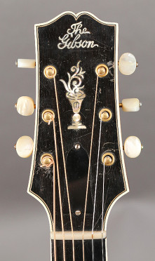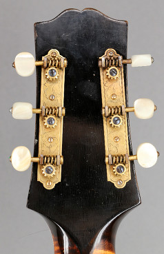 Hardware: Gold-plated metal parts including wrap-over tailpiece and Waverly three-on-a-strip tuners with engraved base plate and pearl buttons, mounted so that the cog is positioned below the worm gear. Short bound pickguard.