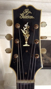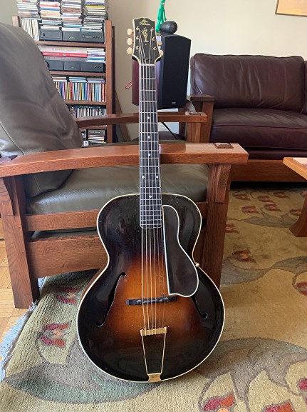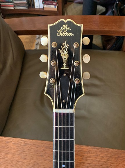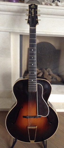 Notes: This L-5 is currently owned by Larry van de Leensel. When he bought it, it came with a letter from its previous owner, Bill H. Watts, who bought it from the Southern California Music Company in 1940. Bill states that the original owner was Eddie Scurvanic, Musical Director of A.B.C. Radio in Hollywood. The guitar later belonged to instrument repairman, Milt Owens, who built and installed a new ebony fingerboard and bridge “to strict Gibson Factory standards”.