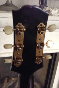 Hardware: Gold-plated metal parts including wrap-over tailpiece and Waverly three-on-a-strip tuners with engraved base plate and pearl buttons, mounted so that the cog is positioned below the worm gear. Short bound pickguard.
