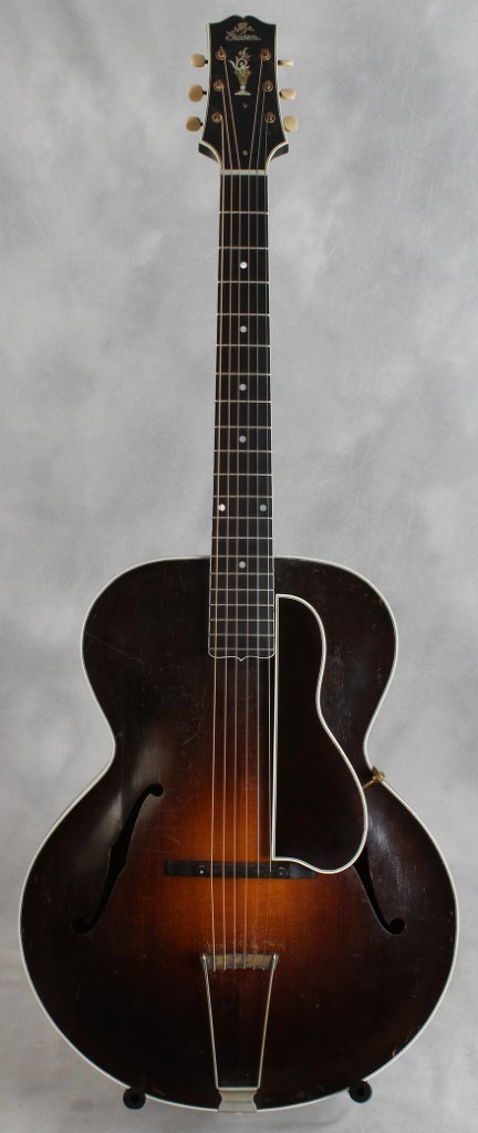 Hardware: Gold-plated metal parts including wrap-over tailpiece and Waverly three-on-a-strip tuners with engraved base plate, mounted so that the cog is positioned below the worm gear. Short bound pickguard
