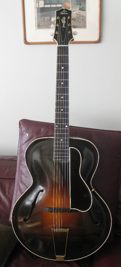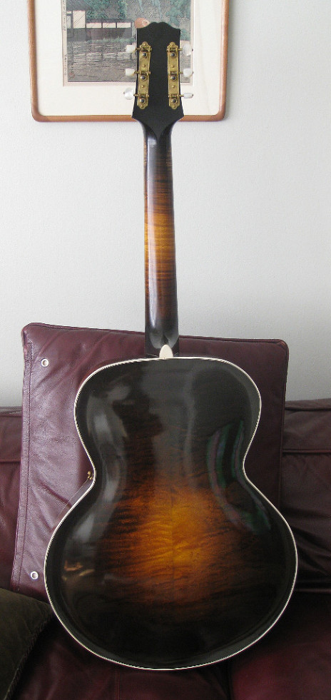 Hardware: Gold-plated metal parts including wrap-over tailpiece and Waverly three-on-a-strip tuners with engraved base plate and pearl buttons, mounted so that the cog is positioned below the worm gear. Short bound pickguard