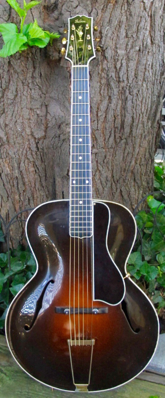 Hardware: Gold-plated metal parts including wrap-over tailpiece. Long bound pickguard and replacement tuners