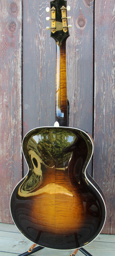 “My L-5 has had a complete refinish,” says owner, Ken Waltham. “It had a bad, old refinish on it, so this is a vast improvement. It was also missing the original hardware and case. I found a proper set of tuners and a tailpiece. The latter was nickel, so I had it gold plated. The pickguard is a repro by Cumberland Acoustics. I also managed to source a Geib red line case.
