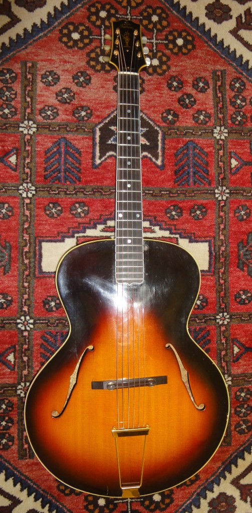 Hardware: Gold-plated hardware including regular trapeze tailpiece. The tuners are modern replacements and the pickguard is missing