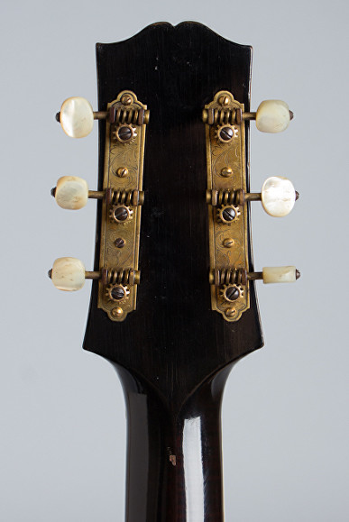 Hardware: Gold-plated metal parts including wrap-over tailpiece and Waverly three-on-a-strip tuners with engraved base plate and pearl buttons mounted so that the cog is positioned below the worm gear. Short bound pickguard