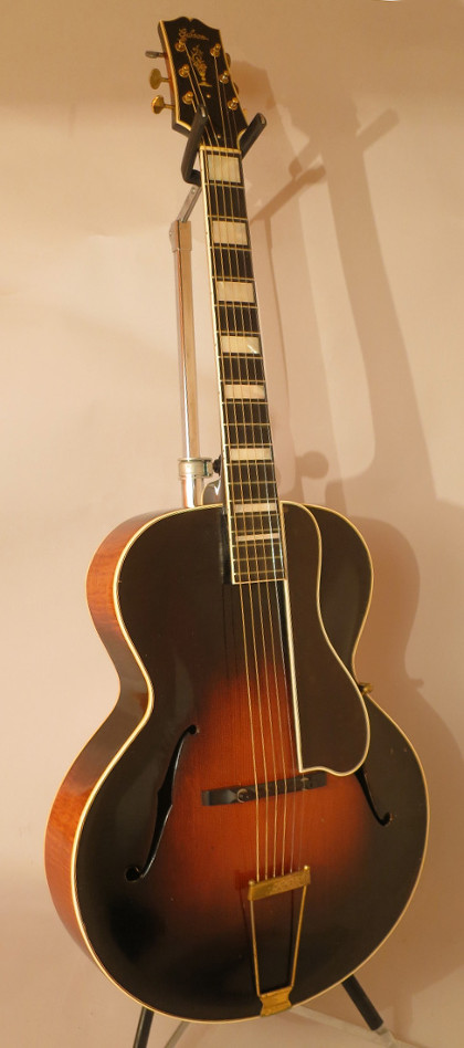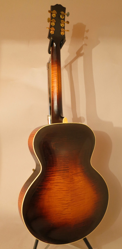 Hardware: Gold-plated metal parts including regular tailpiece and individual open-back Grover 98G ‘Sta-tite’ tuners with butterbean keys (see Notes below). Long bound pickguard