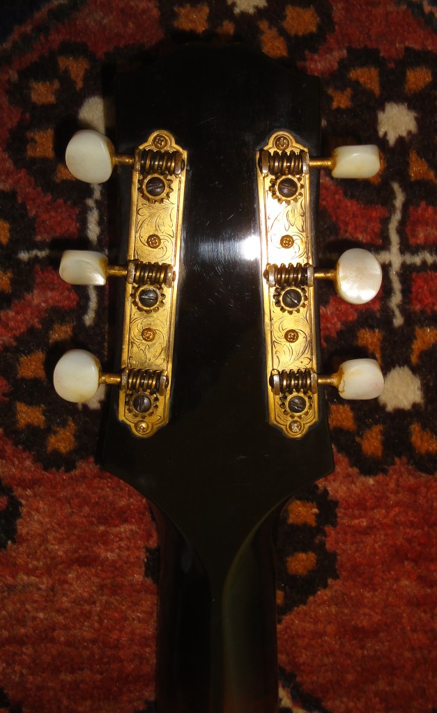 Hardware: Gold-plated metal parts including regular tailpiece and Waverly three-on-a-strip tuners with engraved base plate and pearl buttons, mounted so that the cog is positioned below the worm gear. Long bound pickguard