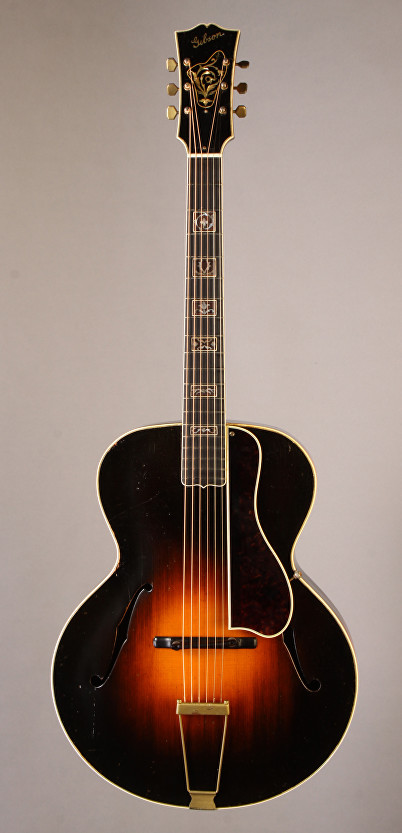 The L-5 pictured here was built to meet the needs of guitarist Carl Kress. It has neck, headstock and heel dimensions unlike those of any other Gibson instrument of the period. The word ‘Special’ is hand-written on its interior label. The fingerboard inlays are enclosed in rosewood rectangles with an ivoroid border and are the same as those found on some 1930s Style 3 Mastertone banjos, the Style 5 Deluxe Mastertone banjo and some L-75 archtops. The headstock inlay also has an ivoroid border and is the same as that found on the mid 1920s style 5 trap-door banjo. A few 17-inch Advanced L-5s from the late 1930s have an identical headstock inlay though in all other respects these are standard L-5s (see serial number: 97670). Though the tuners are a style found on some wartime instruments, they are not typical of an instrument from the early 1930s.
