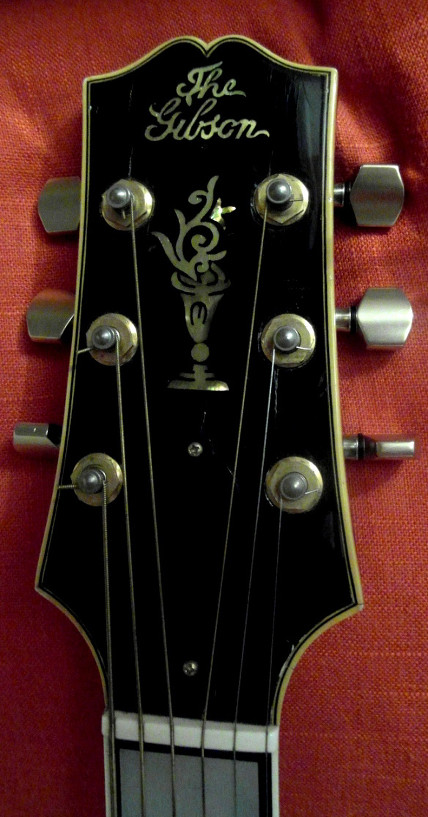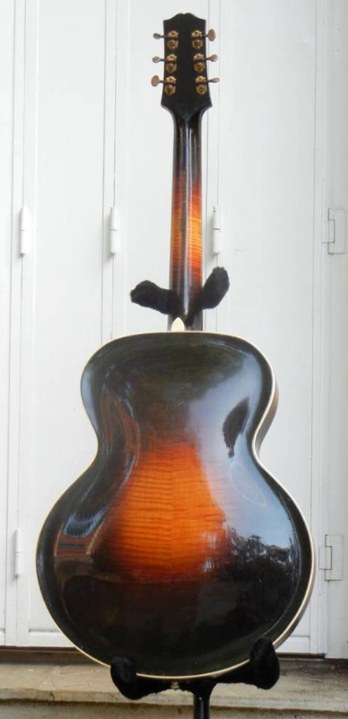 Hardware: Gold-plated metal parts including regular tailpiece and individual open-back Grover 98G ‘Sta-tite’ tuners with butterbean keys. Long bound pickguard