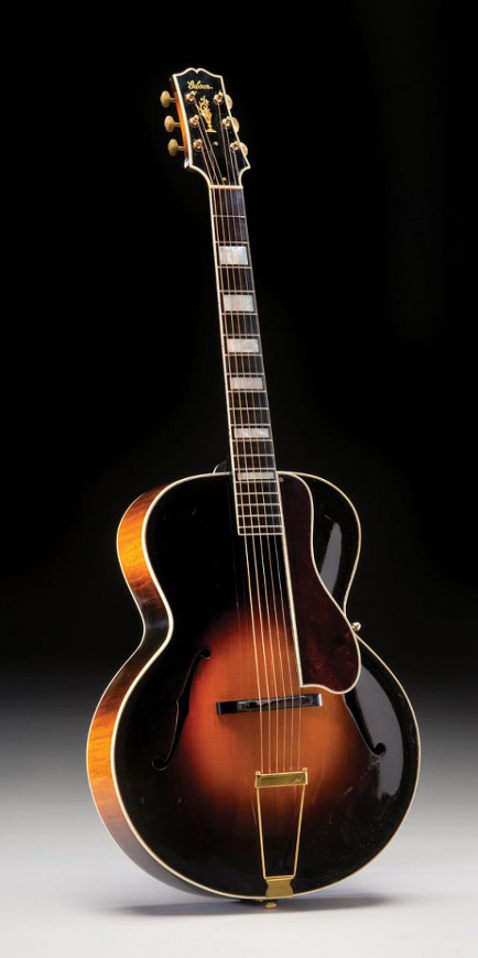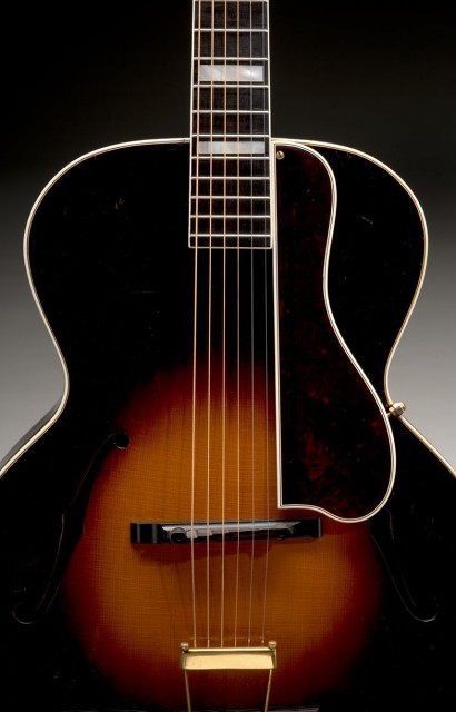 Hardware: Gold-plated metal parts including regular tailpiece and individual open-back Grover 98G ‘Sta-tite’ tuners with butterbean keys. Long bound pickguard and ebony bridge