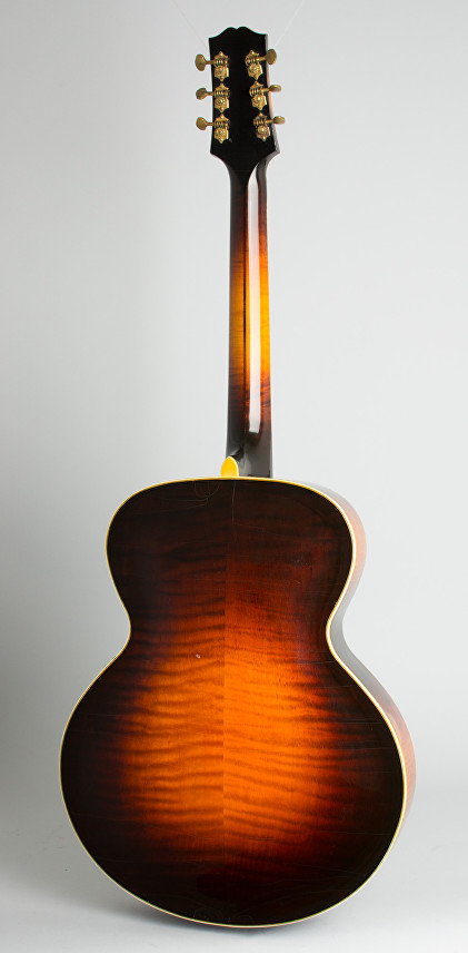 Notes: The top centre seam has been resealed in the area beneath the tailpiece and there is some lacquer overspray over most of the instrument (the headstock face excluded). Reproduction pickguard. Has its original black hardshell case