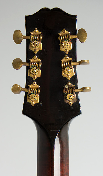 Hardware: Gold-plated metal parts including regular tailpiece and individual open-back Grover 98G ‘Sta-tite’ tuners with butterbean keys.