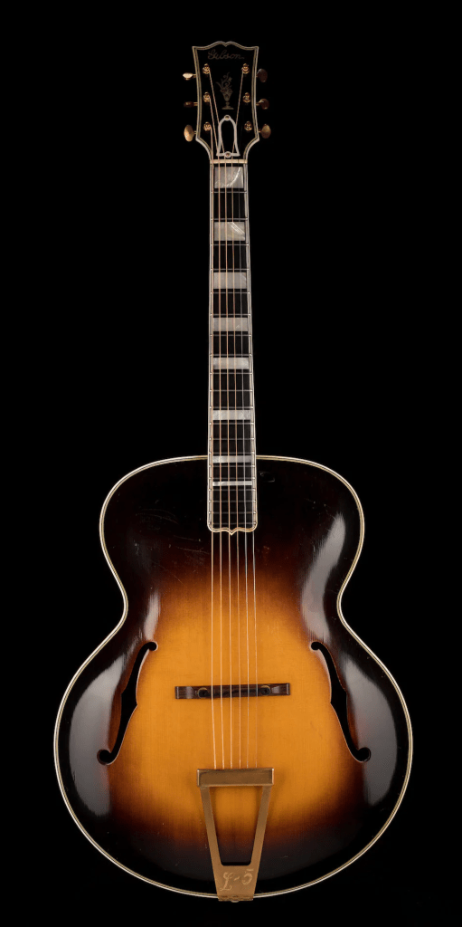 Hardware: Gold-plated metal parts including flat tailpiece engraved with ‘L-5’ legend and individual open-back Grover 98G ‘Sta-tite’ tuners with butterbean keys. Long bound pickguard and rosewood bridge