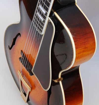 Hardware: Gold-plated metal parts including flat tailpiece engraved with ‘L-5’ legend. Long bound pickguard