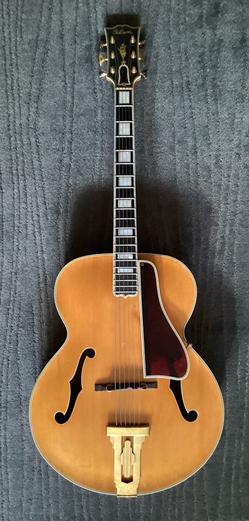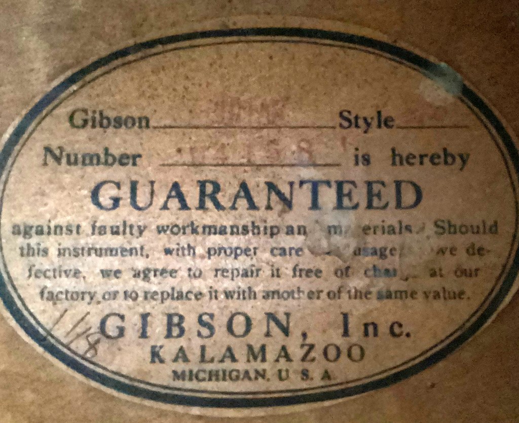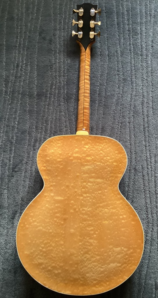 This guitar is one of 7 Natural Advanced L-5s shipped in 1937 (the guitar is described in Gibson’s ledgers (see image below) as ‘spl (special) color’. It is likely that this refers to the fact that the Natural finish option was not officially available until 1939.
