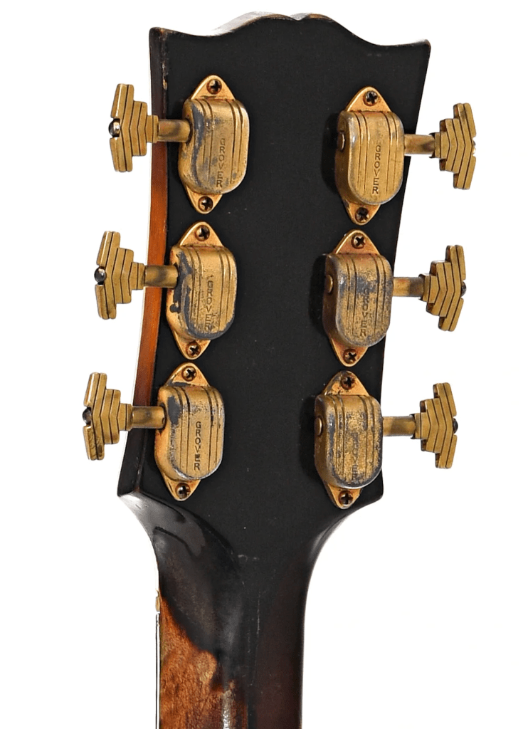 Hardware: Gold-plated metal parts including hinged tailpiece with silver centre insert and three engraved diamonds and Grover Imperial tuners. Has original long bound pickguard and rosewood bridge.