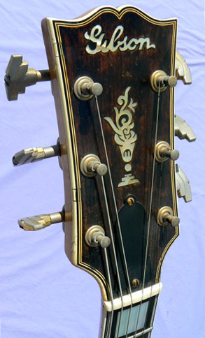 Hardware: Gold-plated metal parts including flat tailpiece engraved with ‘L-5’ legend and Grover Imperial tuners. Long bound pickguard and ebony bridge