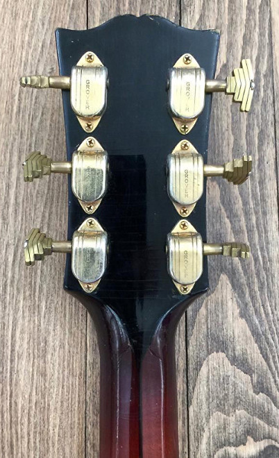 Hardware: Gold-plated metal parts including hinged tailpiece with silver centre insert and three engraved diamonds and individual Grover Imperial tuners. Long bound pickguard and rosewood bridge