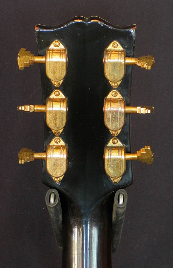 Hardware: Gold-plated metal parts including hinged tailpiece with silver centre insert and three engraved diamonds and Grover Imperial tuners. Rosewood bridge and long bound pickguard