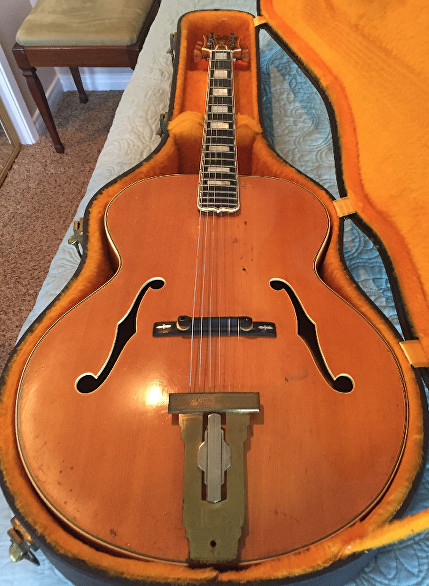 “This L-5N belonged to my dad, Edmund Joseph ‘Bud’ Belter. He lived in Chicago and played most every weekend, generally with the Hal Davis Orchestra. He also played with other musicians and on one occasion appeared with Duke Ellington as a ‘sit in’ musician! My dad passed away in 1967 at the age of 52 and I have had the L-5 ever since then (wow, that’s 50 years ago!) He earned his living as an auto body and fender repairman. His last residence was in Arlington Heights Illinois, where my 101 year old mom still lives.”