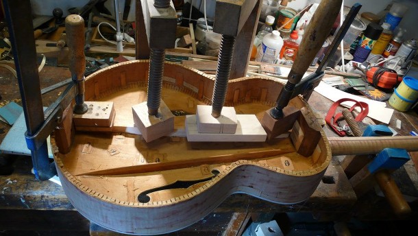 “We started by carefully stripping the red lacquer taking care not to damage the wood. After that we opened the body only to find that there were dozens of cleats all of which were strangely stamped and penciled with crosses – a real piece of naive folk art! A treble side tone brace had been re-glued in the wrong position and in several places the wood had been thinned so much that it was translucent!