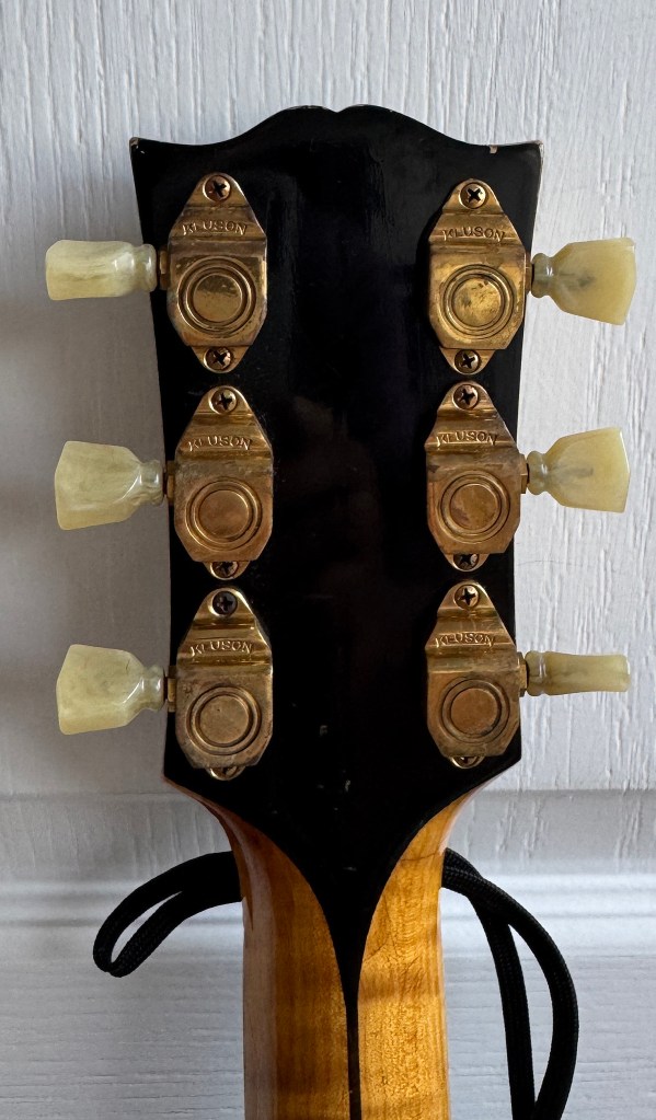 Hardware: Gold-plated metal parts including Varitone tailpiece and Kluson Sealfast tuners with plastic buttons.