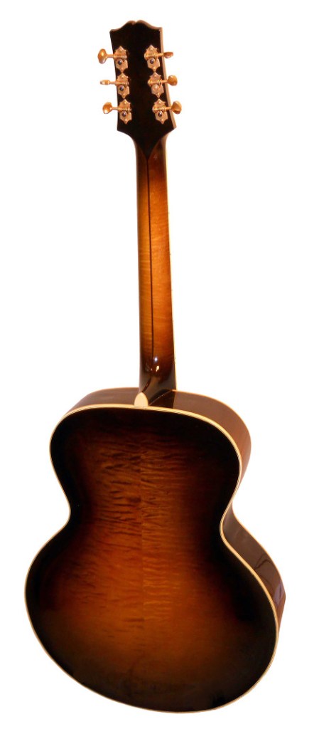 Hardware: Gold-plated metal parts including wrap-over tailpiece and individual tuners. Short bound pickguard