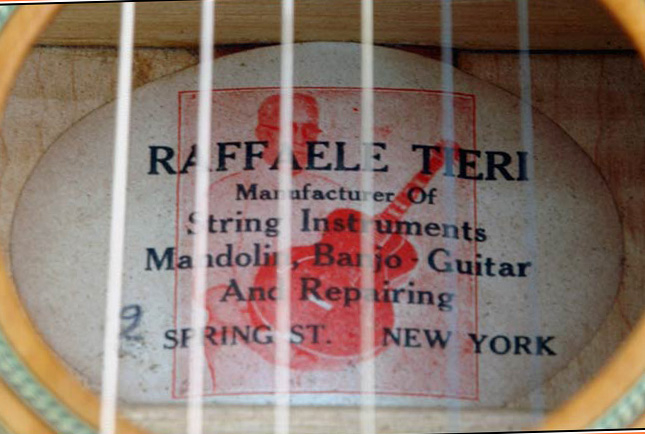 Matt Umanov recalls seeing a variety of instruments by Tieri over the years including mandolins, harp-guitars, flattops and of course 16-inch Gibson L-5 style archtops like the guitar pictured here. “I’ve know of a couple of other Tieri guitars but none as fine as this one,” Matt recalls. “It has huge tone and volume and is right there in the same realm as an early Gibson L-5.” The interior label shows Tieri’s picture and address, for which the building still exists.